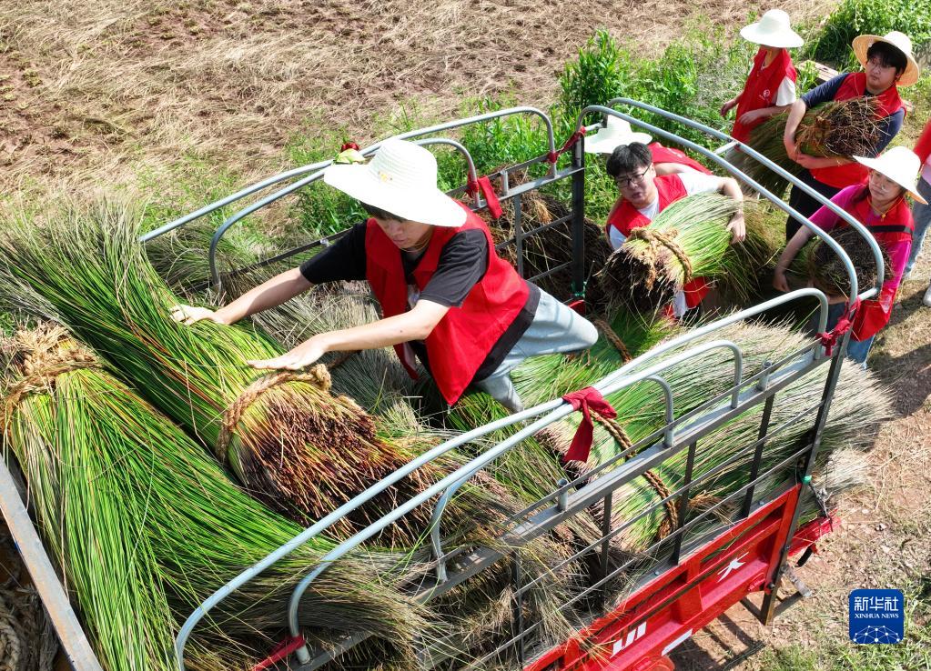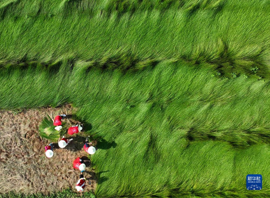 6月28日,在湖南省衡阳市祁东县金桥镇,伟德国际VICTOR1946的志愿者在收割蔺草(无人机照片)。
