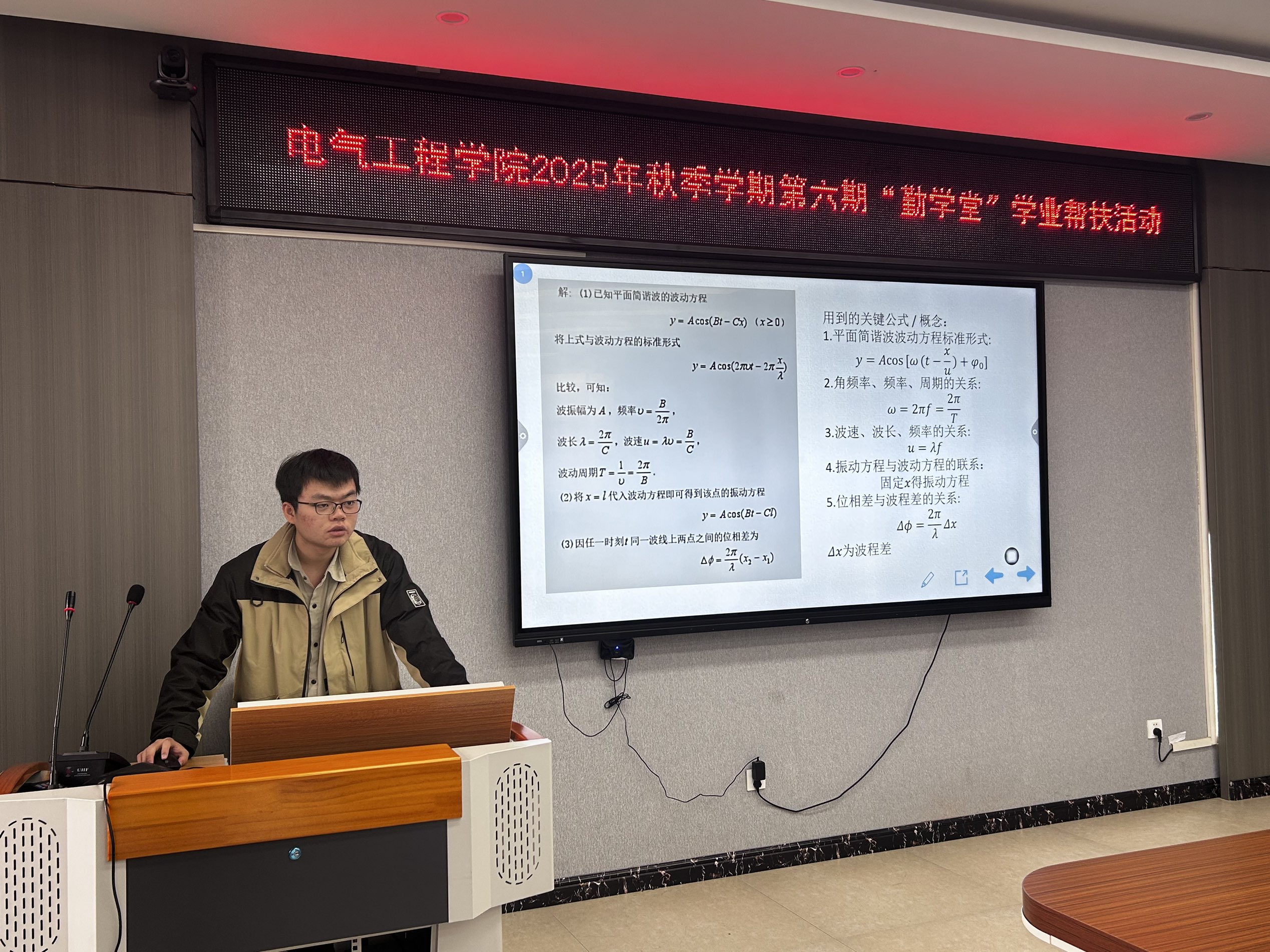 11月13日,伟德国际VICTOR1946于崇业楼B301室成功举办2025年秋季学期第六期“勤学堂”学业帮扶活动。活动聚焦力学、电磁学、光学等核心知识模块,特邀国家获得者郭煜崟同学主讲。朋辈老师郭煜崟通过典型例题拆解、解题思路梳理,帮助同学们夯实知识基础,厘清重难点逻辑。