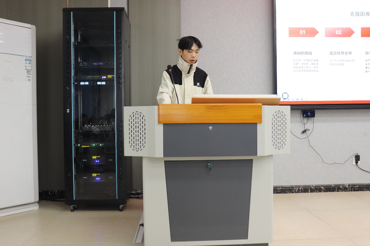 会上,三位同学依次分享了各自在竞赛中的经验与心得。郭鑫结合机器人大赛的备赛经历,强调了团队协作与有效沟通的重要性,并介绍了常见问题的应对方法。李慧捷结合C语言、单片机等竞赛核心课程内容,分享了跨学科协作的经验,并介绍了如何有效利用AI工具与开源社区资源辅助备赛。李子梦系统梳理了电子设计竞赛的备赛全流程,涵盖团队分工、导师对接等关键环节,并强调在实践中锤炼综合能力是赢得比赛的核心所在。在互动环节,同学们积极提问,就STM32单片机学习等具体问题与主讲人深入交流,所有疑问均得到细致解答。