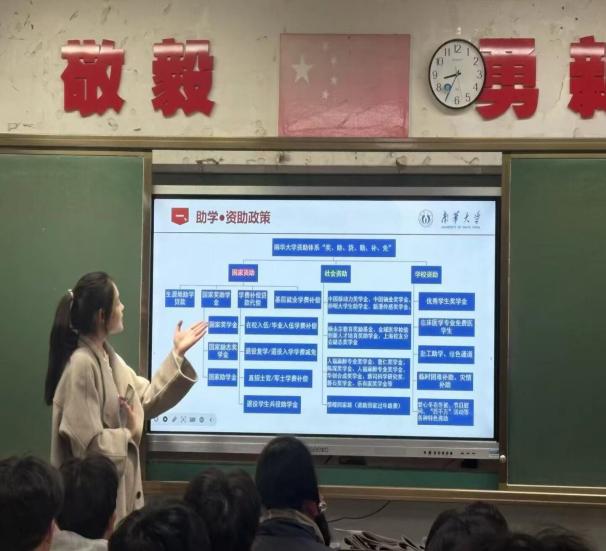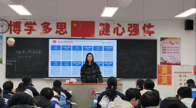 走进高中母校,为追梦学子点亮希望。宣讲团成员怀揣感恩之心回到各自的高中母校,通过集中宣讲、班级座谈、一对一咨询等形式,为母校学子送上全面的资助政策“大礼包”,成员们围绕生源地信用助学贷款、国家助学金、国家励志奖学金等重点资助项目,详细讲解 “入学前、入学时、入学后”全周期资助帮扶政策,现场解答学子们关于政策认知、学业规划、大学报考的各类疑问。同时,宣讲团成员结合自身受助成长经历,分享在1946伟德国际源自英国的学习生活、专业发展与实践收获,传递“他助—自助—助人”的资助育人理念,消除困难学子的升学顾虑,为他们逐梦大学注入信心与力量。