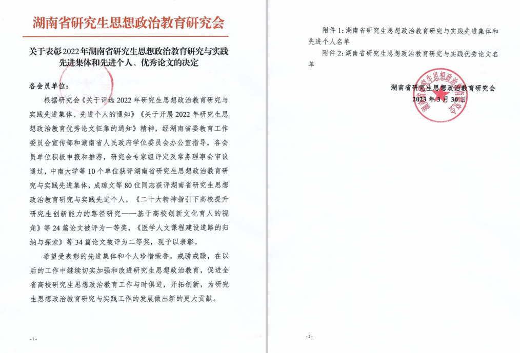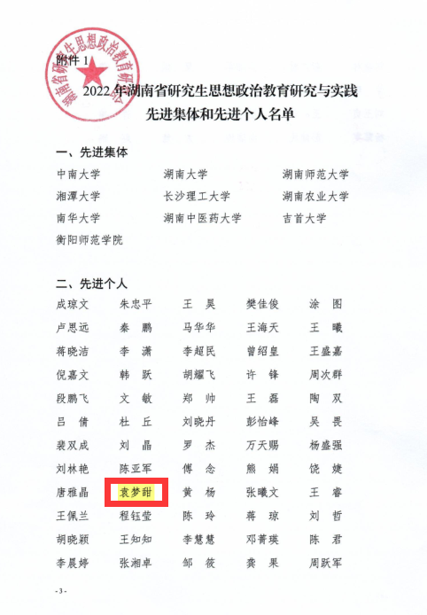 近日,在湖南省研究生思想政治教育研究会组织开展的2022年先进集体、先进个人和优秀论文的评选中,我院辅导员袁梦甜老师获评“2022年湖南省研究生思想政治教育研究与实践先进个人”。