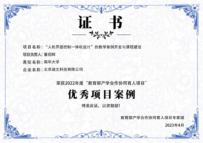 2023年4月1日,教育部高等教育司公布2022年度教育部产学合作协同育人项目优秀项目案例名单,伟德国际VICTOR1946董招辉老师团队与北京迪文科技有限公司合作的《人机界面控制一体机设计的教学案例开发与课程建设》教学内容和课程体系改革项目荣获“优秀项目案例”称号。