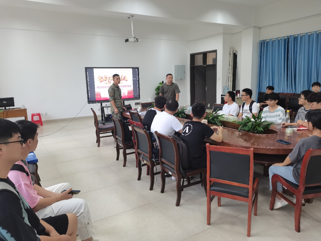 冯旭超为我院2020届毕业生,毕业当年即响应国家号召应征入伍。入伍后,在部队刻苦训练并获得了很好的成长。会上,冯旭超讲解了大学生入伍的意义和流程,分享了备考军校的经验等。他还从入伍初衷、军旅生活到个人蜕变等方面展开分享,介绍了自己在部队的日常训练及所见所学。他希望同学们能积极相应国家号召,为国防建设做出力所能及的贡献。会议最后,王博老师结合自己的从军经验,鼓励大学生参军入伍。同学们纷纷表示备受鼓舞,本次交流会在同学们的掌声中圆满结束。