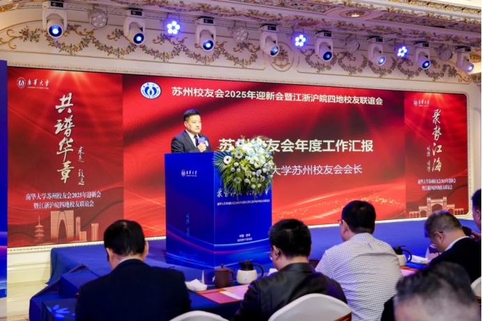 随后,苏州校友会刘宴麟会长带来年度工作汇报。他全面回顾了苏州校友会过去一年的工作成果,分享了校友服务、资源联动等方面的实践与探索,并描绘了未来发展的清晰蓝图,让在场校友对校友会的发展充满信心。