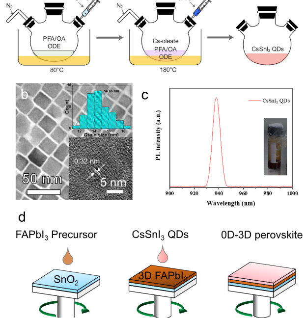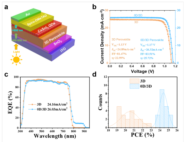 研究团队开创性地设计零维/三维(0D/3D)异质结架构(图1),采用CsSnI₃量子点作为多功能界面层,通过创新性的级联能级设计、表面钝化处理、防潮性能优化及光吸收增强等多重协同效应,显著提升了钙钛矿太阳能电池的能量转换效率与长期稳定性,为低成本、高性能光电器件的产业化应用开辟了新路径。未来可应用于建筑一体化光伏(BIPV)、柔性电子设备及空间能源系统等领域。