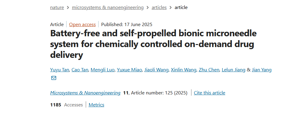 文献信息:Yuyu Tan, Cao Tan, Mengli Luo, Yuxue Miao, Jiaoli Wang, Xinlin Wang, Zhu Chen, Lelun Jiang, and Jian Yang*, Battery-free and self-propelled bionic microneedle system for chemically controlled on-demand drug delivery, MICROSYST NANOENG, 2025, 11: 125.