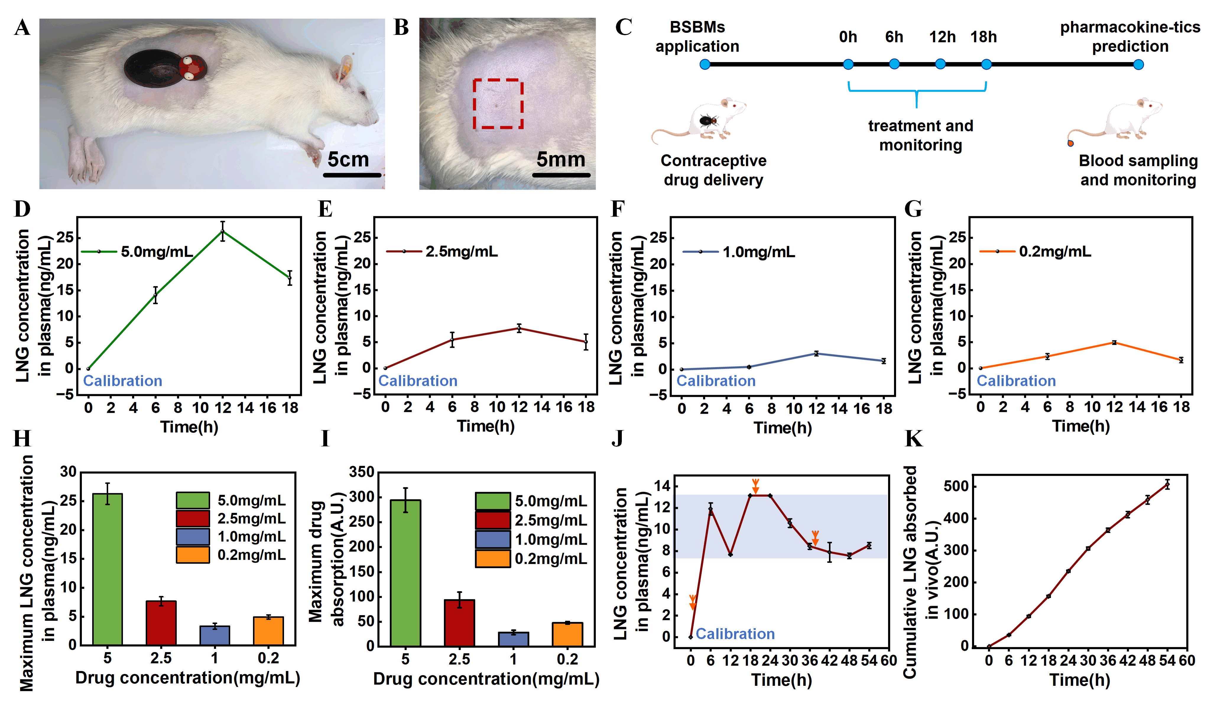 图4. BSBMs的体内药物释放性能评估。(A)BSBMs应用于麻醉大鼠的实物照片;(B)应用后大鼠背部照片;(C)单次18小时给药周期实验时间轴。SD大鼠体内药代动力学分析(四种不同给药浓度):(D)5 mg/mL LNG;(E)2.5 mg/mL LNG;(F)1 mg/mL LNG;(G)0.2 mg/mL LNG。(H)BSBMs给药不同剂量组的Cmax值;(I)BSBMs给药不同剂量组的AUC值;(J)2.5 mg/mL LNG三次给药后(红色箭头示给药时间点)SD大鼠体内药代动力学分析;(K)2.5 mg/mL LNG三次给药后体内LNG累积吸收量。