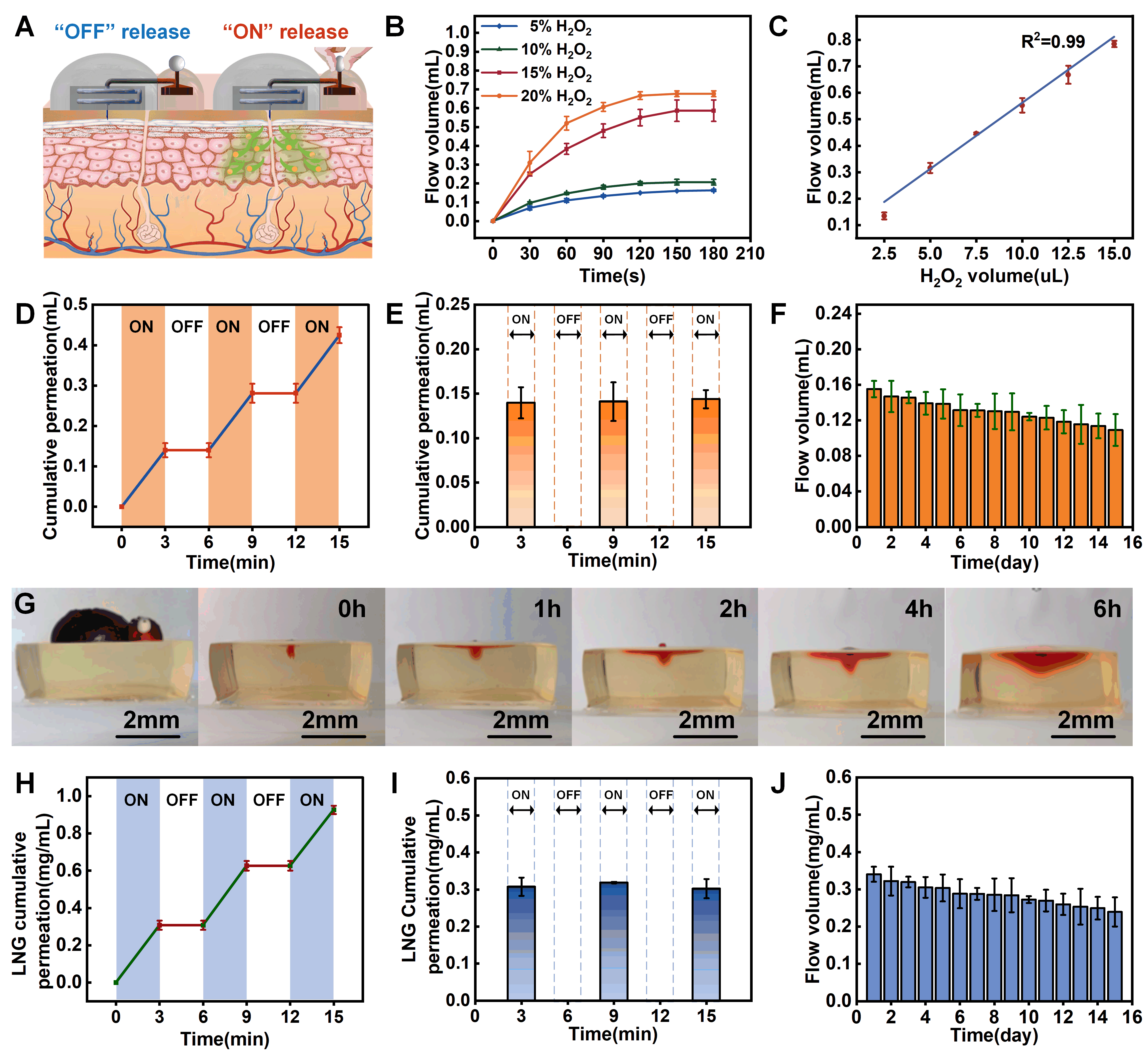 图3. BSBMs的体外药物释放评估。(A)化学控制给药机制示意图;(B)不同浓度H2O2对给药效果的影响;(C)相同浓度不同体积下H2O2 3分钟内的流量累积情况;(D)显示"开关"式药物递送控制的折线图;(E)每次3分钟间隔产生的释放量;(F)使用红色染料测试的BSBMs长期稳定性;(G)BSBMs应用在模拟皮肤琼脂糖凝胶中染料渗透扩散的时序图像;(H)"开关"循环操作的间歇性LNG药物释放;(I)每个"开关"循环的LNG浓度累积;(J)使用BSBMs进行LNG递送的长期稳定性。