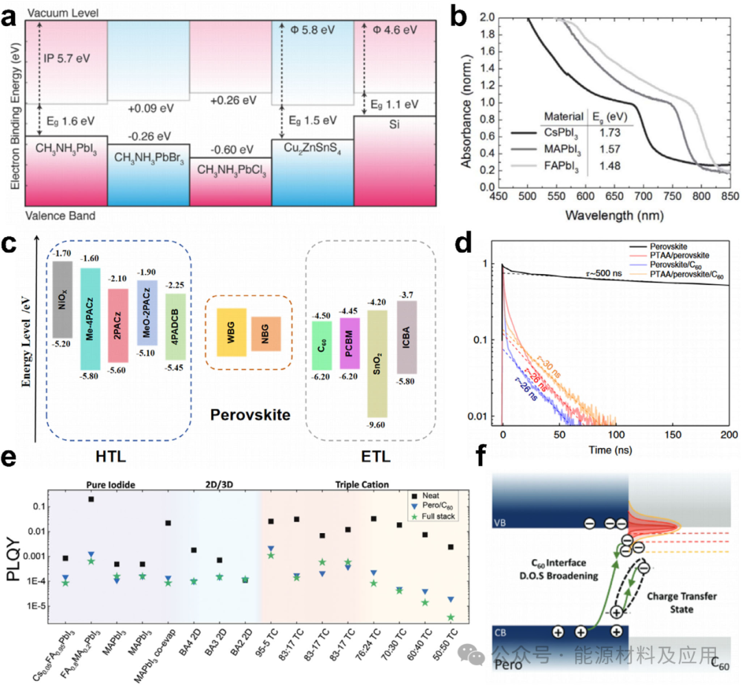 图3、a) CH₃NH₃PbI₃及其相关材料的自然带阶图;b) 不同A位阳离子APbI₃钙钛矿的紫外-可见吸收光谱;c) 能级失配示意图;d) 钙钛矿层与传输层界面的TRPL谱图;e) C60诱导的复合损耗统计图;f) C60界面复合机制示意图。
