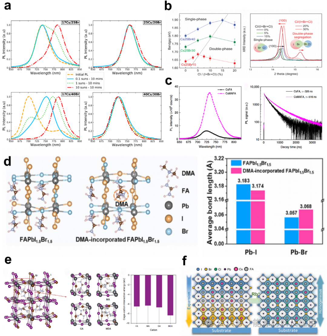图10、a) 不同Cs⁺/Br⁻比例下的PL稳定性对比;b) 三元卤素体系中Cl⁻浓度对带隙与相结构的影响;c) MA⁺引入前后的PL与TRPL对比;d) DMA⁺掺杂前后的Pb-I键长变化;e) 不同有机阳离子与晶格氢键作用强度对比;f) Rb⁺掺杂对离子分布与晶格常数的影响。