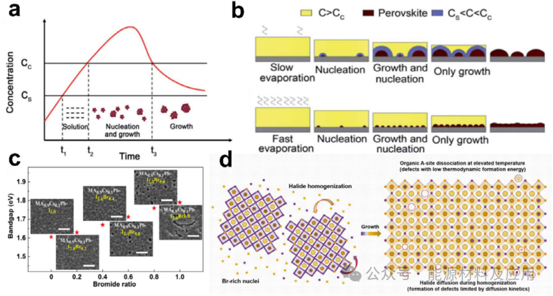 图4、a) 钙钛矿前驱液浓度随时间演化图;b) 溶剂蒸发速率对结晶行为的影响模型;c) 不同Br⁻含量钙钛矿薄膜的SEM图;d) 高Br含量钙钛矿形成动力学与缺陷模型图。