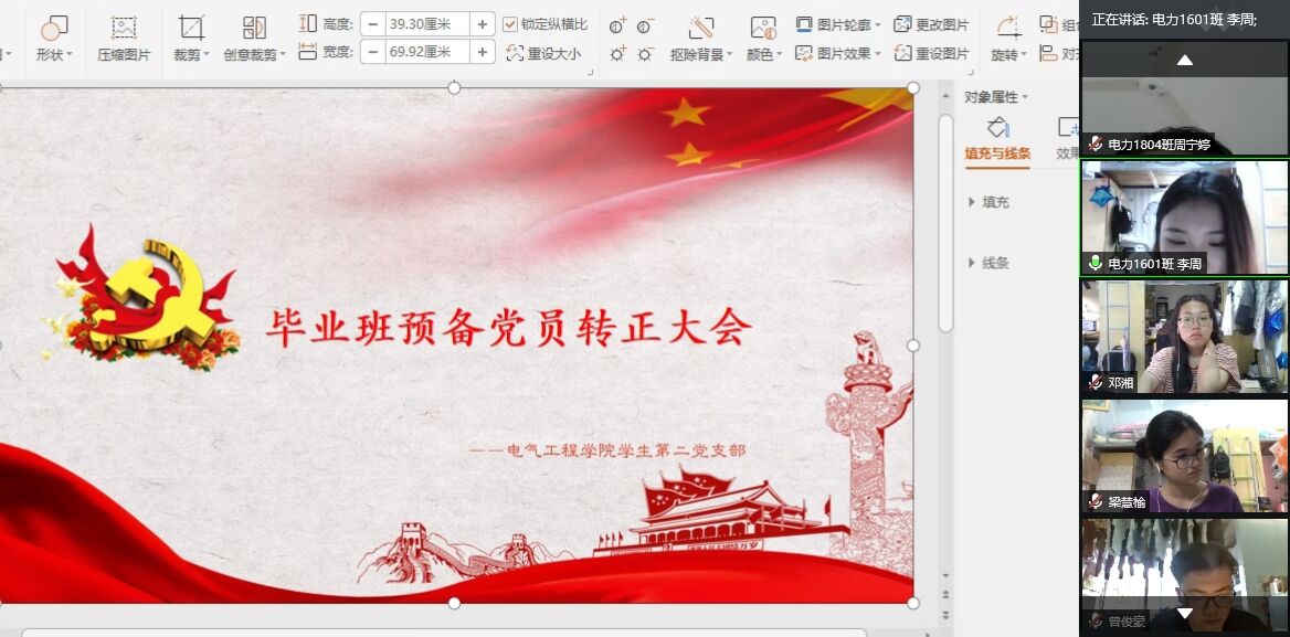 2020年6月5日中午13点,伟德国际VICTOR1946学生第二党支部于腾讯会议APP召开了线上支部党员大会。会议的主要内容为讨论谢嘉等6名毕业生预备党员同志的转正问题。参与本次会议的人员为支部全体党员,应到44人,实到43人,1人请假。会议由支部组织委员周郁主持,支部书记周珍珍老师出席。