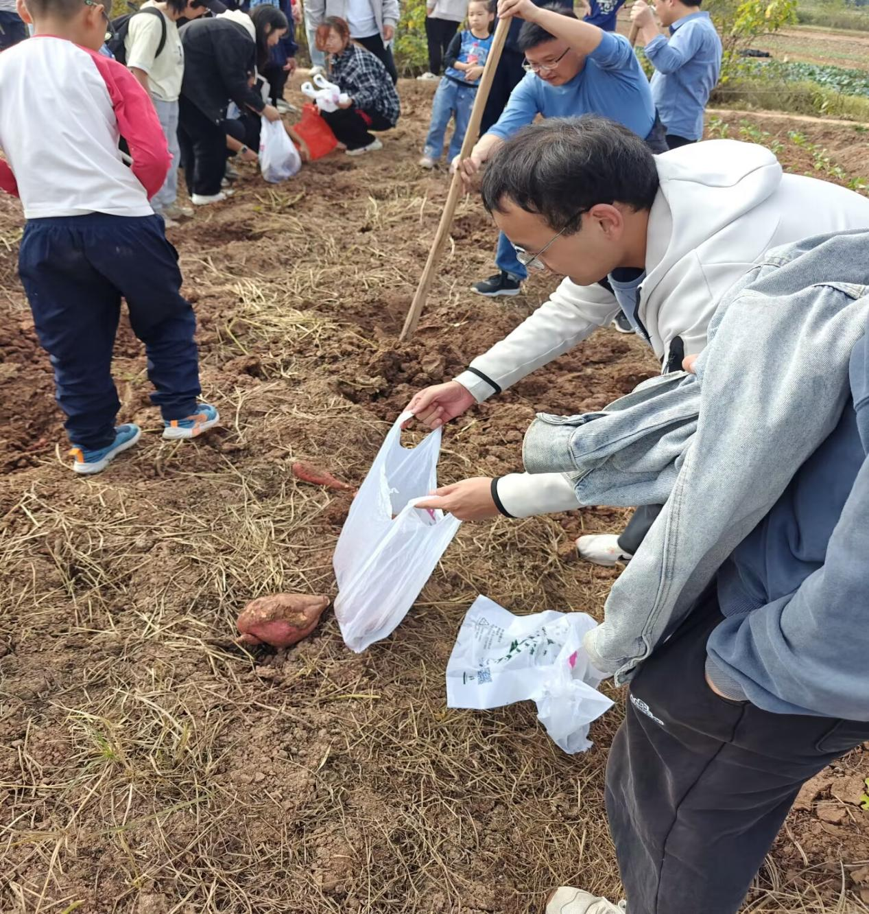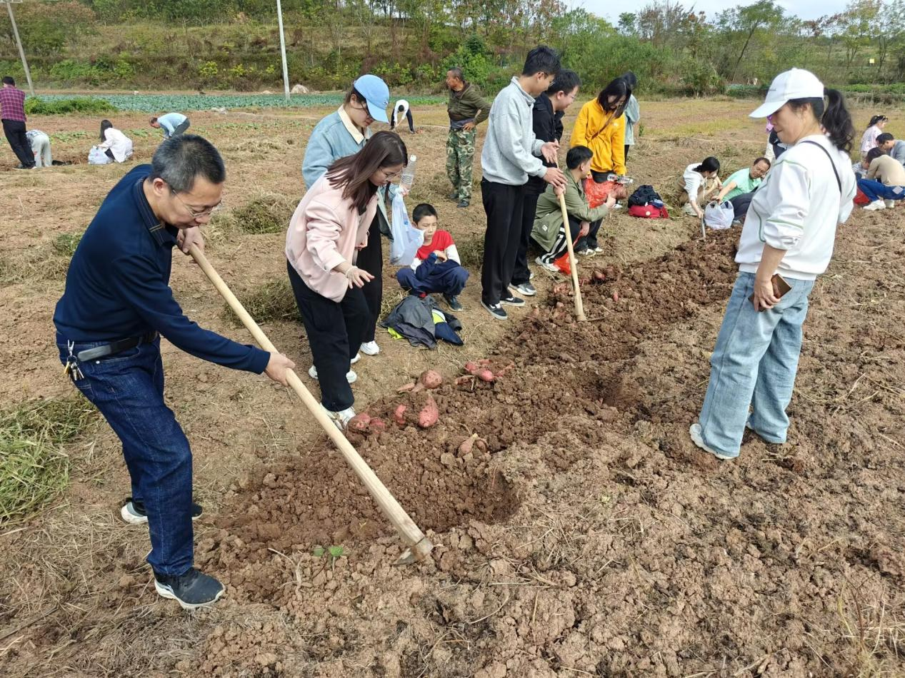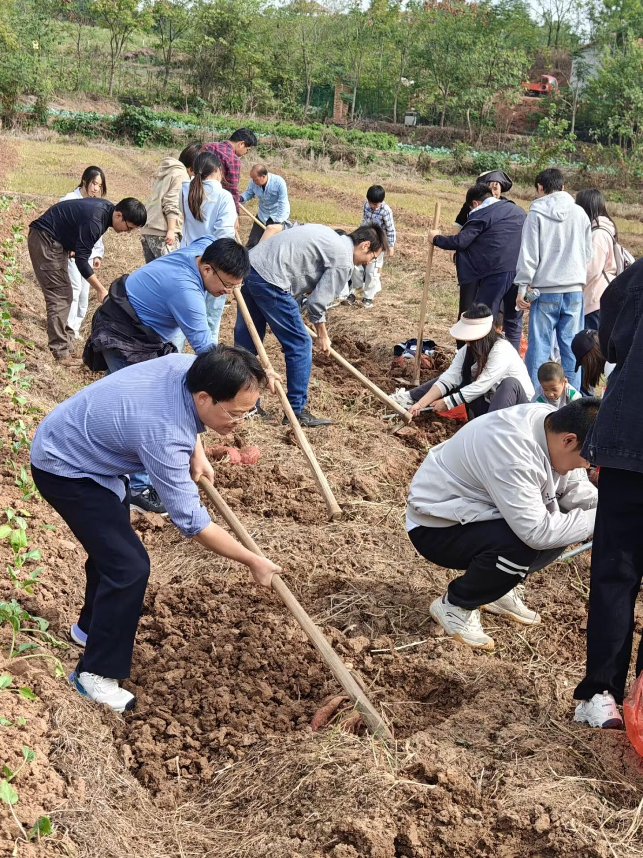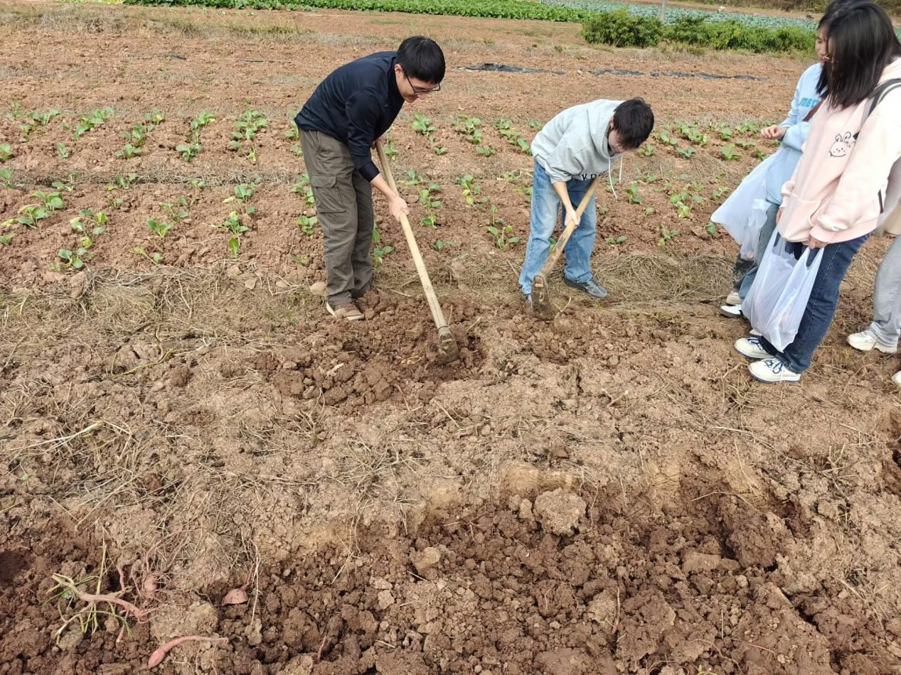 纸上得来终觉浅,绝知此事要躬行,最后全体师生来到田地干农活——挖红薯。大部分自小在城里长大的师生第一次拿起锄头,都有点茫然无措,只是凭本能去挥舞锄头,虽然很努力但效果不佳半天都刨不出一个红薯或者直接将红薯挖坏;而在老家干过农活的师生,一招一式都显得很老道,握紧锄把高高扬起锄头,猛然发力在红薯根苗附近约一尺的地方,先松土再刨出一个大小适中的坑,不仅效率高而且挖出的红薯全部都没有损坏。根据实际情况迅速调整,由一个干过农活的带几个不会干的,手把手教授劳动技能,讲的细致听得认真,很快一切都变得井然有序起来,劳动效率也大幅提高。虽然汗水打湿了脸庞,身上双手沾满泥巴,甚至个别人手掌还磨出了水泡,但劳动的喜悦无法掩盖,收获的欢笑声适中飘荡在农田周围。不到两个小时的劳动让所有参与者感到收获满满,师生们纷纷表示:以前听闻“一粥一饭,当思来之不易;半丝半缕,恒念物力维艰”只觉词句幽美,但只有亲自参与劳动、近距离接触劳动者,才能更加真切地体会劳动的艰辛与意义。